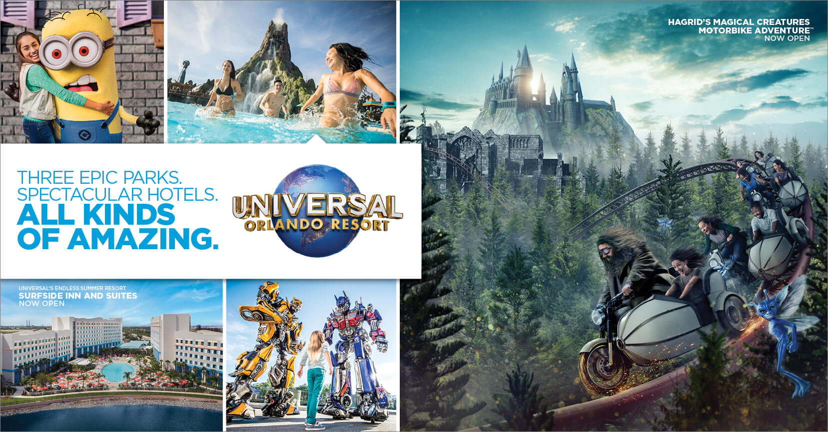 Take a vacation beyond anything you’ve experienced before at Universal Orlando Resort. Journey through legendary worlds of incredible heroes at Universal’s Islands of Adventure. Here you’ll find The Wizarding World of Harry Potter™ - Hogsmeade™, where you can ride the thrilling new roller coaster, Hagrid’s Magical Creatures Motorbike Adventure™, now open. Meet the mischievous Minions and join forces with the TRANSFORMERS as you immerse yourself in the next generation of blockbuster entertainment at Universal Studios Florida. Enjoy the thrills and relaxation of a tropical paradise like no other at Universal’s Volcano Bay water theme park. From theme park excitement, to spectacular hotels in the center of it all, each offering a range of exclusive theme park benefits, to the dining and entertainment of Universal CityWalk, Universal Orlando Resort is a vacation of endless awesome.